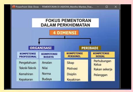 Program yang memberi tumpuan kepada pembangunan kompetensi (kemahiran, pengetahuan, nilai kerja) pegawai dalam melaksanakan tugas dan tanggungjawab. - Pementoran Kepimpinan